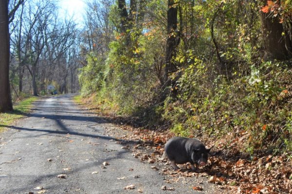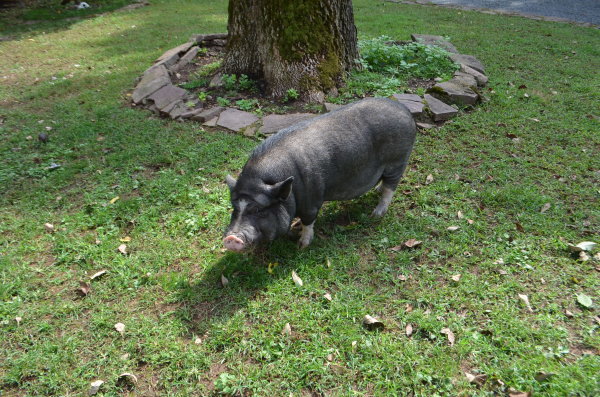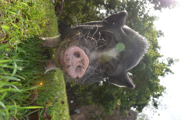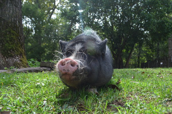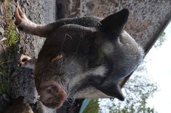 Winston lives in the barn at Ross Mill Farm. He was born in a barnyard and has been surrendered twice: once at 8 weeks old with his siblings (he's one of seven piglets we called the Giggle Gang), then adopted in July 2010, and then he was surrendered again in Jan '19. He was crate trained and an an indoor pig years ago and was good with a ramp. He was moved to outside environment in summer 2017 due to poor potty habits. Winston is chipped, fine with kids ages 3-15, ok with big & little dogs, and best buds with chickens. (Dogs and pigs should always be supervised and never left alone when together.)